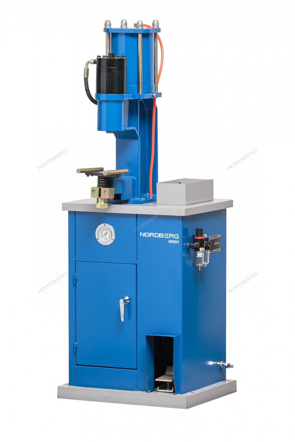 В отличие от пневматического станка, он создает давление для клепания с помощью гидравлического цилиндра. Сжатый воздух используется в качестве привода для гидравлического насоса. Что обеспечивает более плавный и стабильный ход штока.