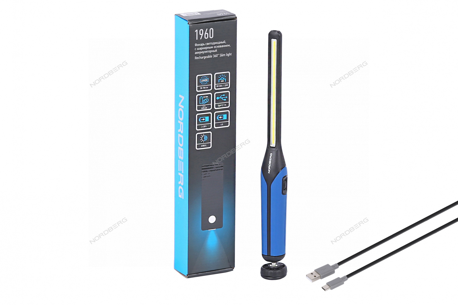Светодиодный аккумуляторный фонарь с шарнирным основанием NORDBERG 1960 – осветительный прибор для профессионального использования в автосервисах и СТО.