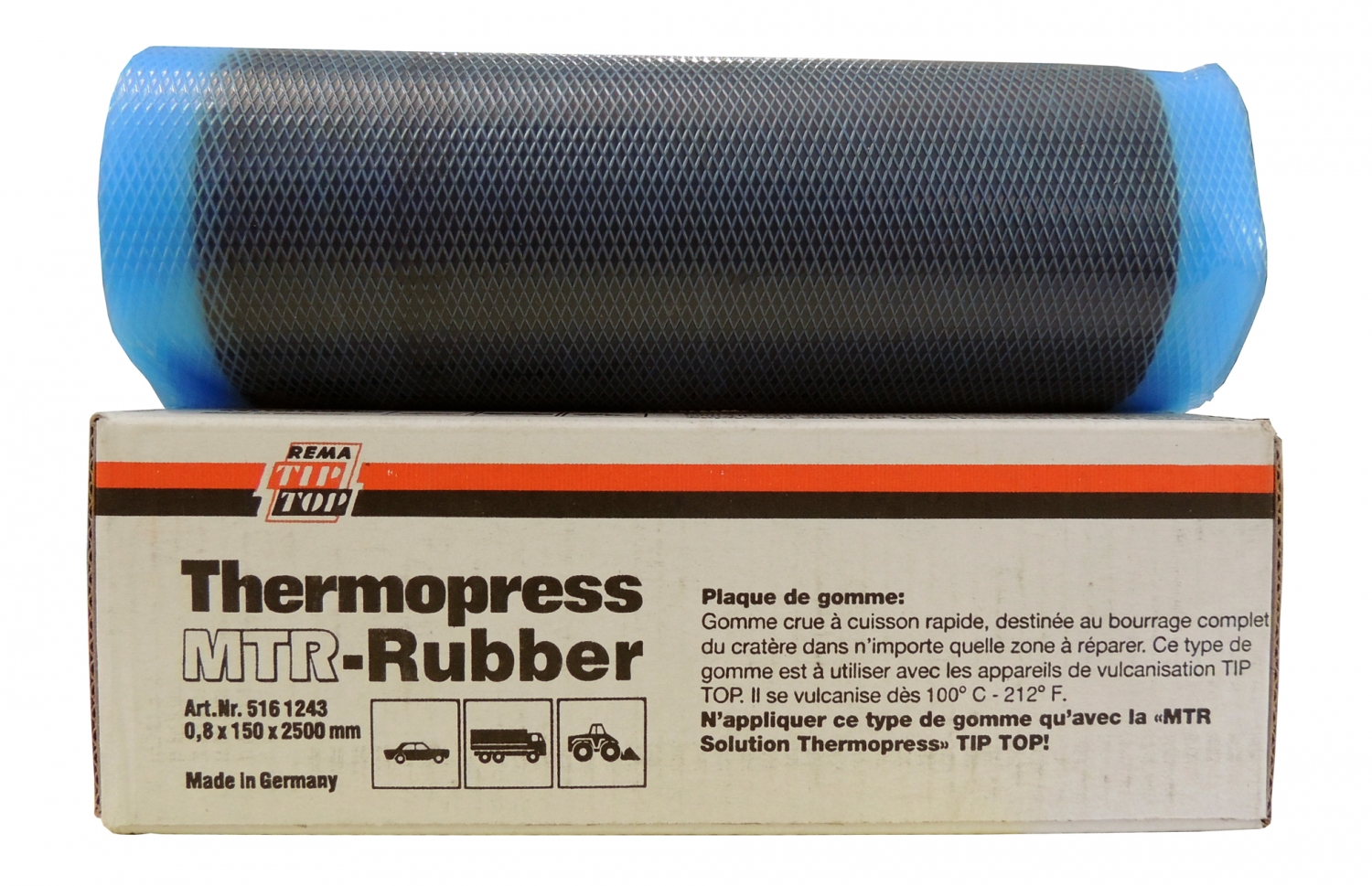 Данная смесь сырой резины предназначена для заполнения каналов повреждений в любом месте шины. Обладает отличными свойствами и текучестью. При этом минимальная температура вулканизации составляет 100°С. Воронку повреждения необходимо заполнять резиной одного качества, благодаря этому получается более сильное сцепление с резиной шины при динамически большей нагрузке колеса. Резина Thermopress MTR должна быть использована только совместно с раствором MTR-SOLUTION. Максимальная температура подогрева резины не должна превышать 80°С.
