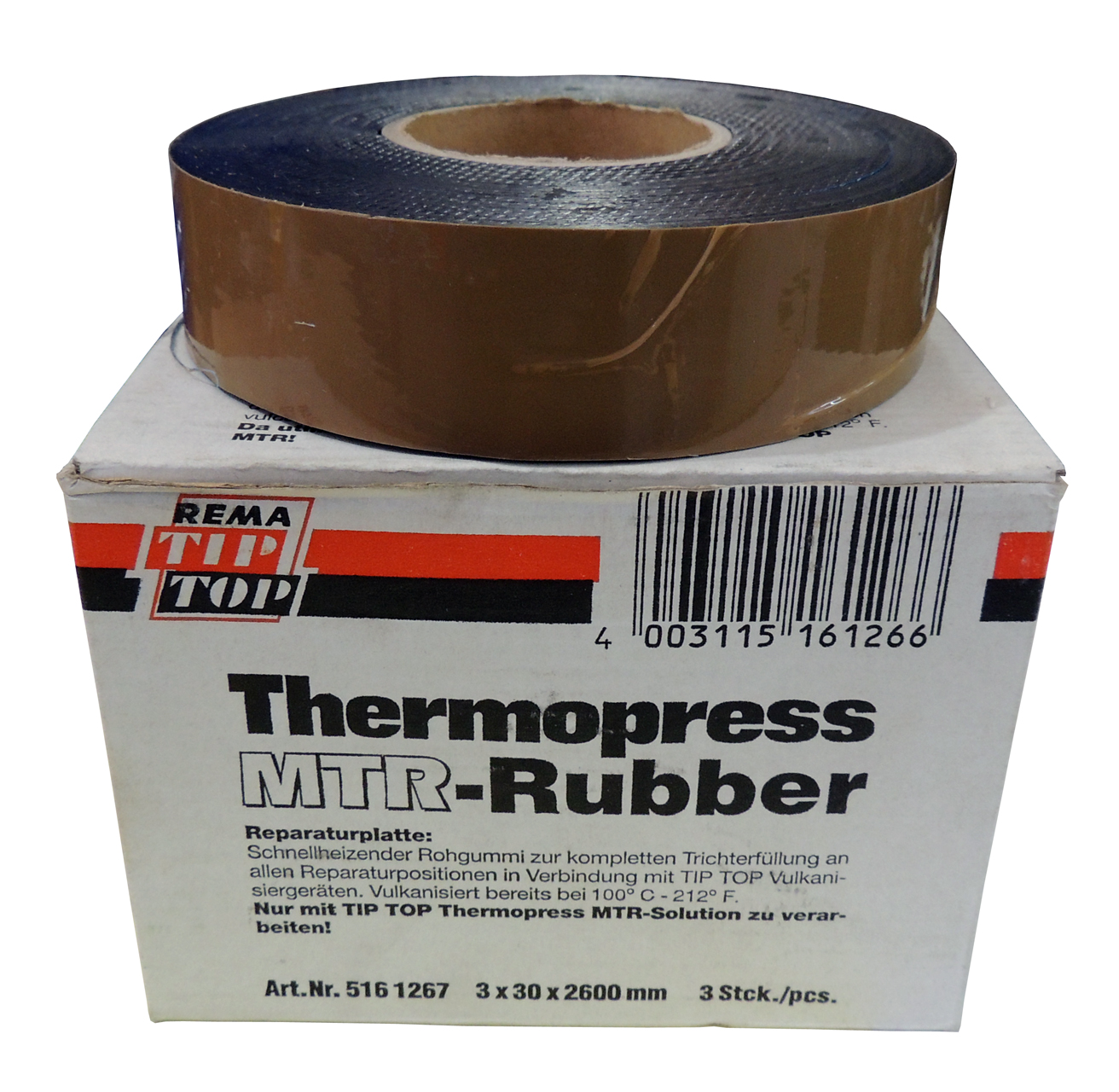 Данная смесь сырой резины предназначена для заполнения каналов повреждений в любом месте шины. Обладает отличными свойствами и текучестью. При этом минимальная температура вулканизации составляет 100°С. Воронку повреждения необходимо заполнять резиной одного качества, благодаря этому получается более сильное сцепление с резиной шины при динамически большей нагрузке колеса. Резина Thermopress MTR должна быть использована только совместно с раствором MTR-SOLUTION. Максимальная температура подогрева резины не должна превышать 80°С.