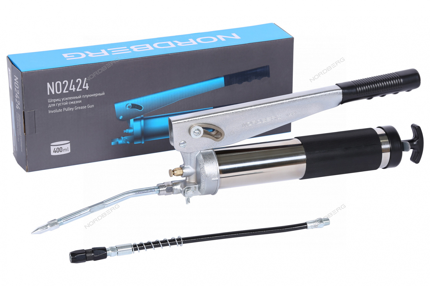 Усиленный плунжерный шприц для густой смазки NORDBERG NO2424 – вспомогательное оборудование для обслуживания узлов и агрегатов автотранспортной техники и промышленного оборудования в автосервисах и СТО.