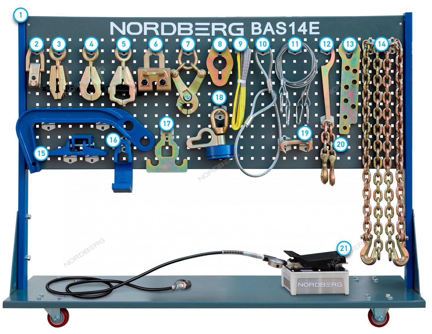 1 шт. 3 Захват кузовной однонаправленный, рабочее усилие 5 т BAS-С1 1 шт. 4 Захват кузовной однонаправленный, рабочее усилие 5 т BAS-С3 1 шт. 5 Захват кузовной усиленный однонаправленный, рабочее усилие 5 т BAS-С4 1 шт. 6 Захват кузовной двунаправленный, рабочее усилие 5т/3т (осевое/поперечное) BAS-С5 1 шт. 7 Зажим ножничный 1 комплект 8 Фиксатор для цепей, рабочее усилие 6 т BAS-CN1 1 шт. 9 Трос обхватывающий нейлоновый BAS-NROPE 1 шт. 10 Трос обхватывающий металлический BAS-MROPE 1 шт. 11 Трос страховочный (комплект 2 шт.) BAS-SROPE 1 шт. 12 Ключ радиусный для регулировки высоты опорных стоек зажимов BAS-RWRENCH 1 шт. 13 Пластина для вытяжки с отверстиями BAS-PP 1 шт. 14 Цепь с крюком (комплект 2 шт.) 1 комплект 15 Крюк вытяжной со сменными упорами, рабочее усилие 4 т BAS-H1 1 шт. 16 Крюк вытяжной J-тип, рабочее усилие 6 т BAS-H2 1 шт. 17 Разветвитель для цепей, рабочее усилие 3 т BAS-CN2 1 шт. 18 Захват кузовной для вытяжки "чашек" передних стоек, 3 т BAS-C8 1 шт. 19 Захват цепи двухсторонний, рабочее усилие 2т BAS-CN3 1 шт. 20 Соединитель цепи с крюками 1 шт. 21 Насос пневмогидравлический, 1600 мл 1 шт. 22 Крючки для вывешивания аксессуаров 24 шт.