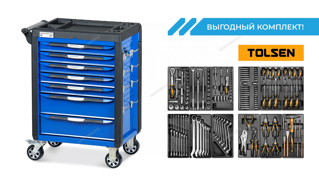 Тележка инструментальная NORDBERG T7P с семью выдвижными ящиками и набором инструментов TOLSEN BOXER для удобства работы и хранения инструмента в автосервисах, СТО и частных гаражах.