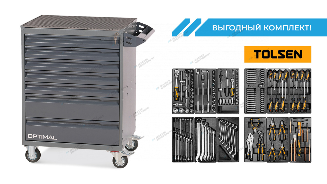 Тележка инструментальная OPTIMAL NT317 с семью выдвижными ящиками и набором инструментов TOLSEN BOXER для удобства работы и хранения инструмента в автосервисах, СТО и частных гаражах.