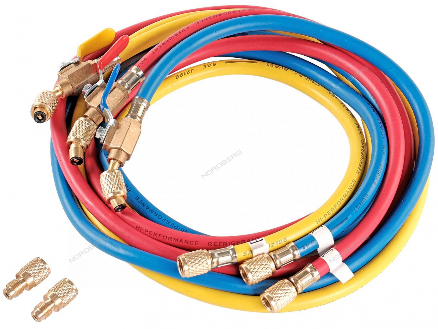 Шланг заправочный NORDBERG NFH18 предназначен для работ по обслуживанию автомобильных систем кондиционирования воздуха, а также различных климатических и холодильных систем.
